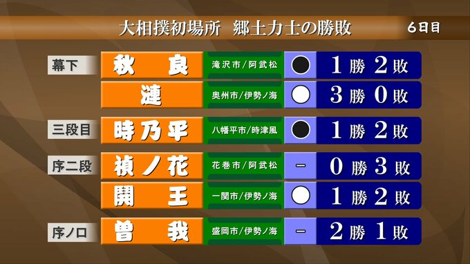 続いては大相撲初場所6日目、郷土力士の取り組みの結果です。