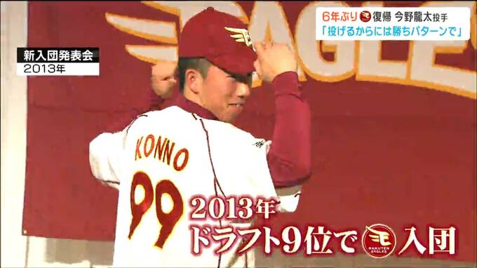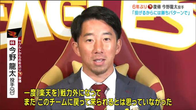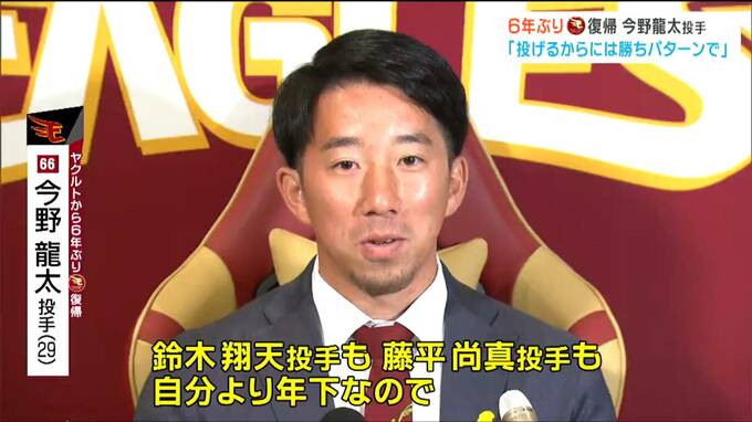 プロ野球楽天イーグルス、ヤクルトからトレードで楽天に復帰した岩出山出身、今野龍太投手が17日、入団会見に臨み、決意を語りました。