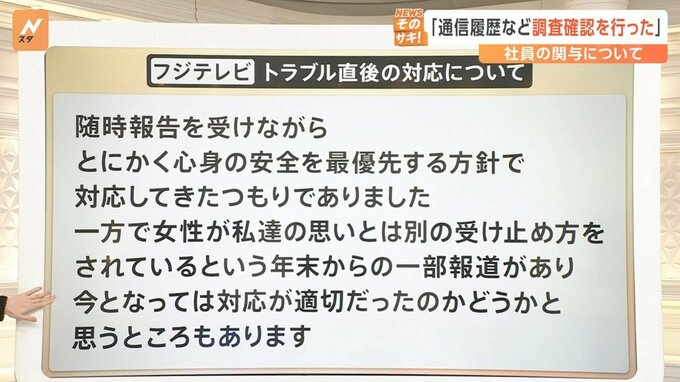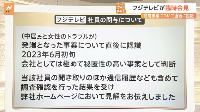 今回の会見でフジテレビは社員の関与について「(中居氏と女性のトラブルが)発端となった事案について直後に認識。2023年6月初旬。会社としては極めて秘匿性の高い事案として判断。当該社員の聞き取りのほか、通信履歴なども含めて調査確認を行った結果を受け、弊社ホームページにおいて見解をお伝えしました」と説明しました。