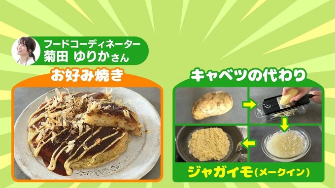 キャベツの代わりになるのはジャガイモ。メークインをスライサーでカットしてお好み焼きにいれると食べ応えもアップして、シャキシャキ感も楽しめる。ポイントは、水にさらして、でんぷんを抜くこと。