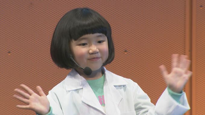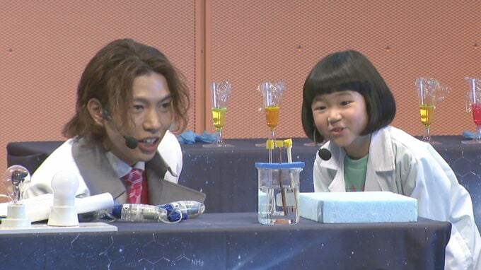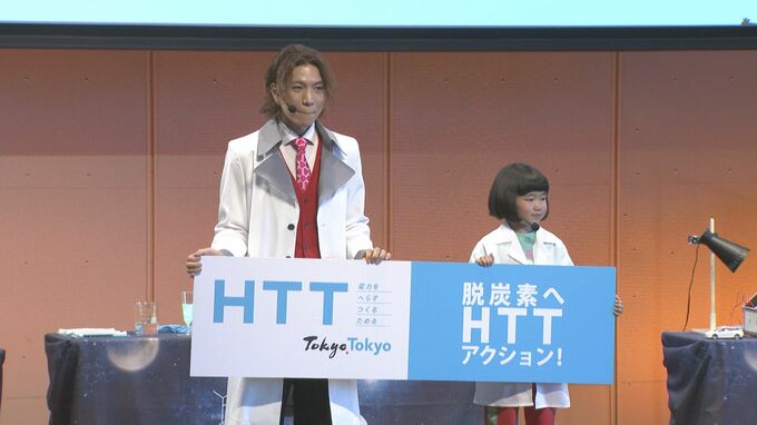 「電力を(H)へらす・(T)つくる・(T)ためる」の頭文字からとった「HTT」は、脱炭素化に向けたアクション。その一環として市岡さんが「HTT」サイエンスライブを開催し、柚乃さんが実験の「特別助手」として白衣を着て登場しました。