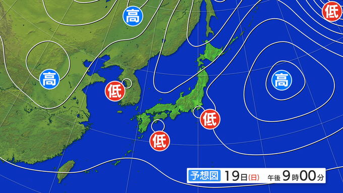 19日午後9時の予想天気図です。関東の南海上に低気圧が通過する見込みです。
