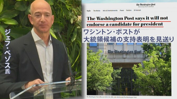 さらに、論説部門が民主党・ハリス候補の支持を表明しようとすると、オーナーのベゾス氏が阻止したと報じられた。
