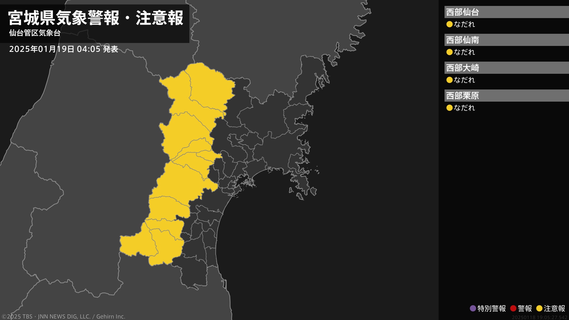 気象台は、午前4時5分に、なだれ注意報を仙台市西部、白石市、栗原市西部、大崎市西部、蔵王町、七ヶ宿町、川崎町、大和町西部、大衡村、色麻町、加美町に発表しました。