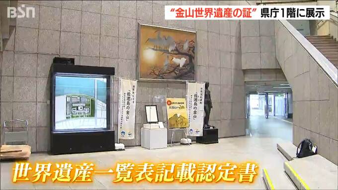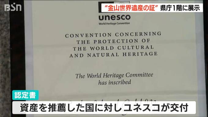 「佐渡島の金山」が世界遺産に登録されたこと示す認定書が20日、新潟県庁に展示されました。