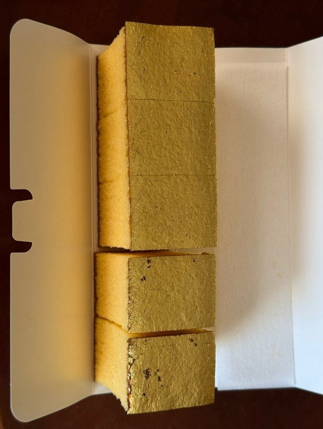 投稿された画像では、カステラに輝く金箔が付けられているのが見て取れます。