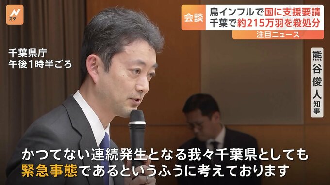 千葉県の養鶏場で相次いで鳥インフルエンザが確認されたことを受け、熊谷知事はきょう午後、農水副大臣と会談し、国に改めて支援を要請しました。熊谷俊人知事「かつてない連続発生となる我々、千葉県としても緊急…