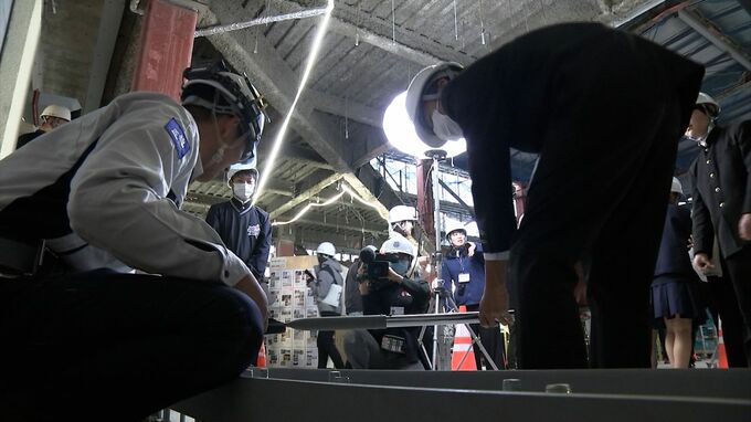 赤磐市と荒木組のイベントに参加したのは、市内の中学生21人です。建設会社の従業員から説明を受け、機械を使って地面と水平な角度を測ったり、大きなボルトを締めたりと、現場での作業を体験しました。