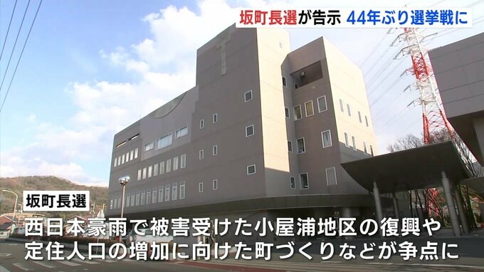 坂町では1981年の町長選以降、無投票が続いていて、今回は44年ぶりの選挙戦となります。選挙戦では西日本豪雨で大きな被害を受けた小屋浦地区の復興や、定住人口の増加に向けた町づくりなどが争点になりそうです。