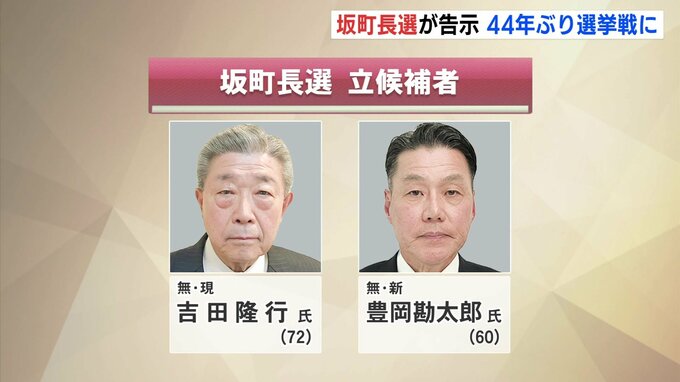 坂町長選に立候補したのは、届け出順に無所属の現職で9期目を目指す吉田隆行氏と、無所属の新人で消防団副団長の豊岡勘太郎氏の2人です。