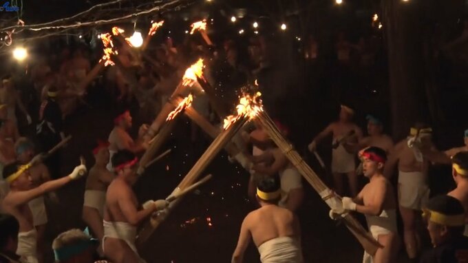 境内では、下帯姿の男たちが長さ2メートルあまりの松明を振りかざしてぶつけあう「火たきのぼり」を行いながら常行堂を目指して進んで行きます。