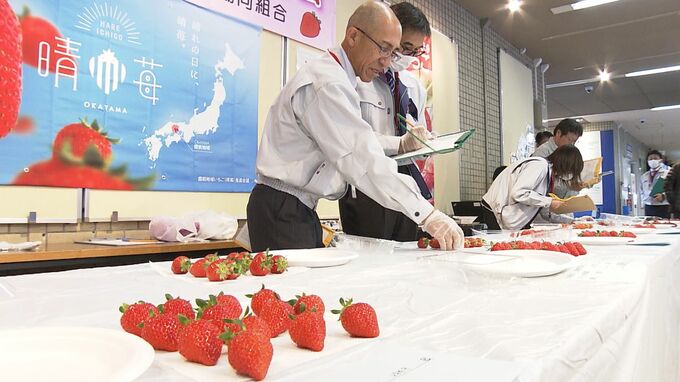 イチゴ農家の栽培技術の向上を目指します。各農家が持ち寄ったイチゴを審査する共進会が岡山市役所で開かれました。