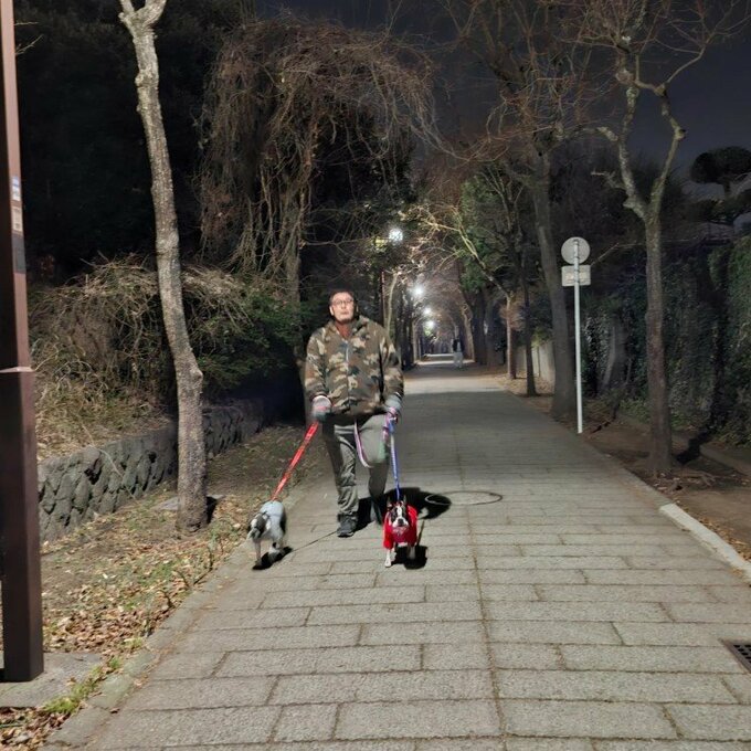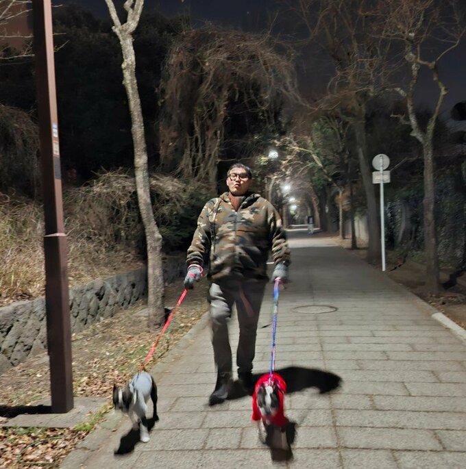 貴乃花さんは「大寒ですが、今日は暖かい陽気でした。夜のお散歩をしてきました。なな、にいちは元気一杯です」と写真を投稿。夜の撮影だけに、肝心の愛犬の方はブレブレです。