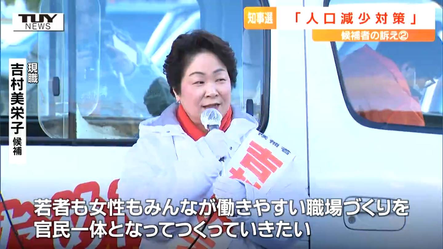 現職 吉村美栄子 候補「女性も働きやすい職場、これを力入れていかないといけないんです。若者も女性もみんなが働きやすい職場づくりというものを官民一体となってつくっていきたいと思っています」