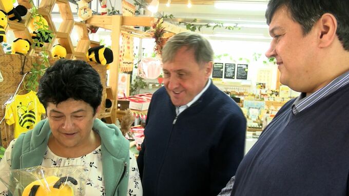 安全な日本でリラックスした表情をみせるのは、ウクライナからやってきた養蜂家や食品業界の代表ら3人の視察団です。今月(1月)14日に鏡野町を訪れ、山田養蜂場の工場や観光農園などを視察。菓子や化粧品といった加工商品製造のノウハウを学びました。