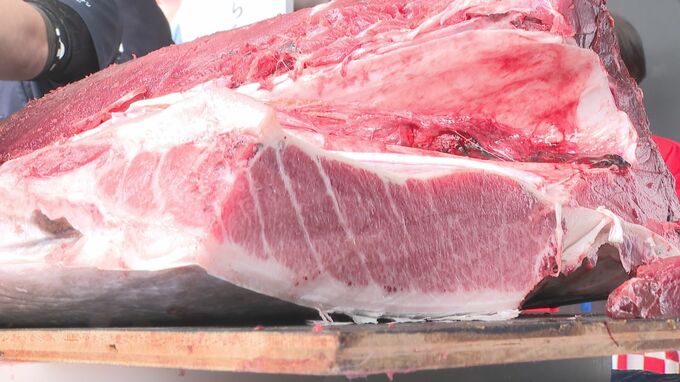 長門市の仙崎地方卸売市場に水揚げされたのは仙崎湾で養殖された155キロ、150キロ、126キロの立派なマグロです。