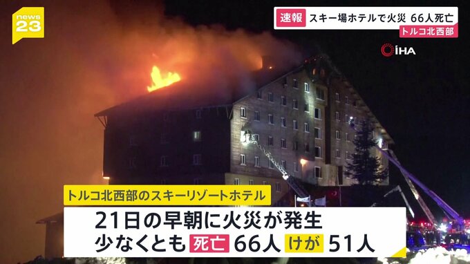 トルコ北西部にあるスキーリゾートホテルで火災が発生し、これまでに66人の死亡が確認されています。AP通信などによりますと、トルコ北西部にある人気のスキーリゾートホテルで21日早朝に火災が発生しました。現在…