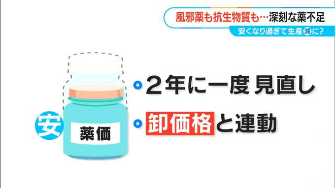 「薬品の値段は、“薬価”と言って、厚労省が決めている。企業が自分たちのかかったコストに見合った分の利益を乗せて売るっていうことができなくて、新しい投資ができなくて、薬の増産や設備投資ができず、悪循環が起こっていて、慢性的に必要な薬を必要な量、供給することができなくなっている」
