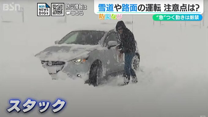 【運転免許センター小林憲司技能指導官】「アクセルを踏みすぎてタイヤを空回りさせ続けるとタイヤの周りの雪や氷が磨かれて脱出しにくくなる」