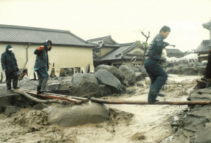 僕が島原市に常駐して2年目、1993年はあまりに災害が多く、4月には土石流で400軒の家が一晩で流されてしまいました。家が壊れている現場で取材しました。火砕流も起きて、6月には自宅が心配で見に帰った方が1人亡くなってしまいました。そしてまた土石流。災害が何か月も続くのです。