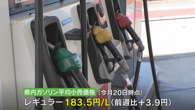 資源エネルギー庁によりますと山梨県内のレギュラーガソリンの平均小売価格は、おとといの20日時点で1リットル183.5円で前の週の179.6円より3.9円値上がりしました。