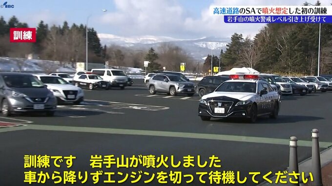 「訓練です、岩手山が噴火しました、車から降りずエンジンを切って待機してください」
