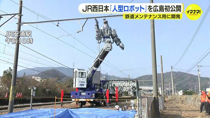 JR安浦駅の構内に登場したのは、JR西日本、人機一体、日本信号の3社が鉄道のメンテナンス用に全国で初めて開発した人型ロボットです。身長は1m、両腕を広げると幅4mにもなり、重さは600キロあるそうです。