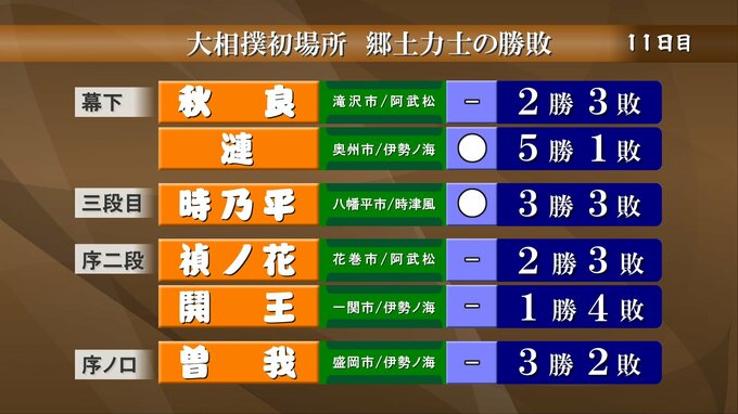 続いては大相撲初場所11日目、郷土力士の取り組みの結果です。