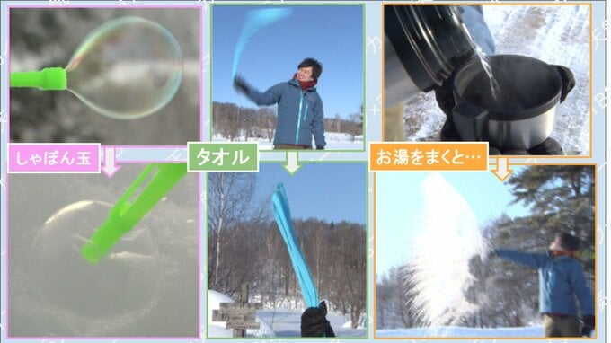 北海道旭川市で行った寒さの実験映像がありました。2011年12月9日、この日の最低気温はマイナス24.3℃。シャボン玉を飛ばしてみると、雪の上でバリバリに凍ってしまいました。また2015年2月4日、この日の気温はなんとマイナス30.2℃。濡らしたタオルを振り回せば1分ほどで凍りつき、カップに入れたお湯をまいてみると、あっという間に氷と湯気のカーテンになりました。
