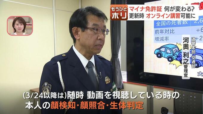 「運転免許試験場や警察署などで、免許更新の際、対面で受けていた講習ですが、今年3月以降、マイナンバーカードと免許証を一体化させると、オンラインで受けることができるようになります」