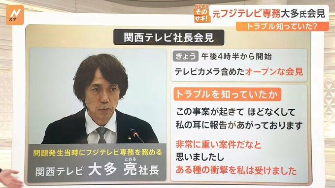 フジテレビの専務をつとめていた関西テレビの大多亮社長が記者会見行い、中居正広さんと女性とのトラブルについて、「事態を把握していた」「ある種の衝撃を受けた」と語りました。
