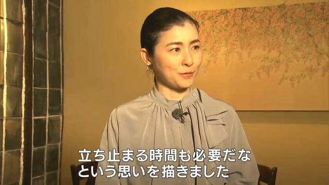 「『喫茶去』は…、場所かな。こちらの場所(レストラン)に来たからですかね。『一服する時間が大事だよ』という意味の禅語なんですけど。走り続けるだけではなくて、立ち止まって、そういう時間も必要だなという思いを描きました」