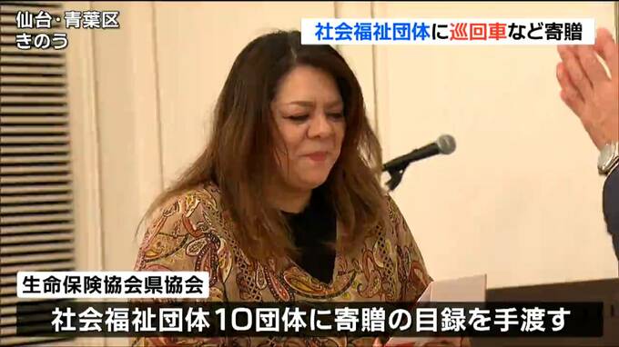22日は生命保険会社30社でつくる生命保険協会県協会が、県内の10の社会福祉団体に寄贈の目録を手渡しました。今回は各社の社員6000人からおよそ280万円の募金が集まり、大河原町社会福祉協議会には、福祉巡回車1台が贈られました。県協会が県内の社会福祉協議会に車両を贈るのは今回で50台目です。