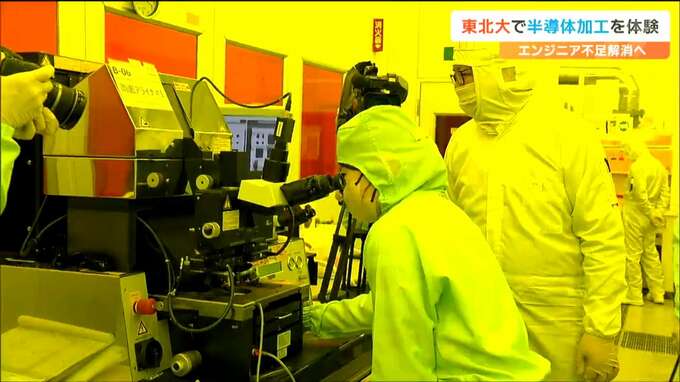 東北大学で開かれた半導体の加工作業の研修会には、宮城県と岩手県で働く派遣会社のエンジニア5人が参加しました。専用のクリーンルームに入った参加者は、シリコン製の基盤に紫外線を当てるなど、電気の流れを制…