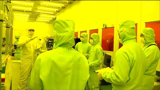 専用のクリーンルームに入った参加者は、シリコン製の基盤に紫外線を当てるなど、電気の流れを制御するシリコン抵抗体を作る工程を体験しました。