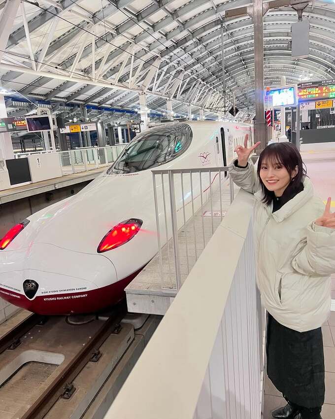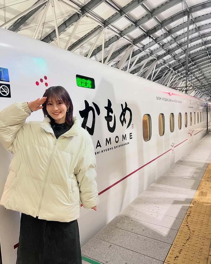 山本さんは駅のプラットフォームに入線してきた新幹線のそばで朗らかにポーズを取った写真を数枚にわたって投稿。中には、山本さんが敬礼ポーズを取っているそばに「かもめ」と大書してある車体の模様も披露しています。