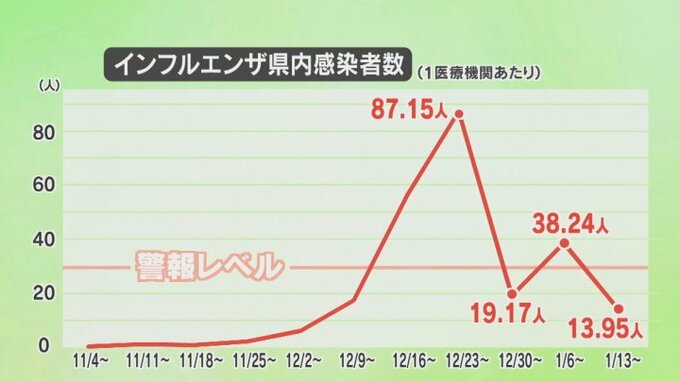 過去10年で最多となった3週間前の87.15人からは6分の1以下に減少し、県感染症対策センターでは「流行の一つ目のピークは超えた感があるが、今後、別の型の流行が懸念される」としています。
