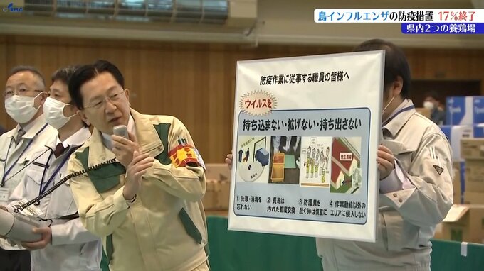岩手県内2つの養鶏場で鳥インフルエンザへの感染のため進められているニワトリの殺処分は、23日午前9時までに全体の17%が終了しました。23日午後4時すぎ、防疫措置を行う職員が集合する施設となっている盛岡市川崎…
