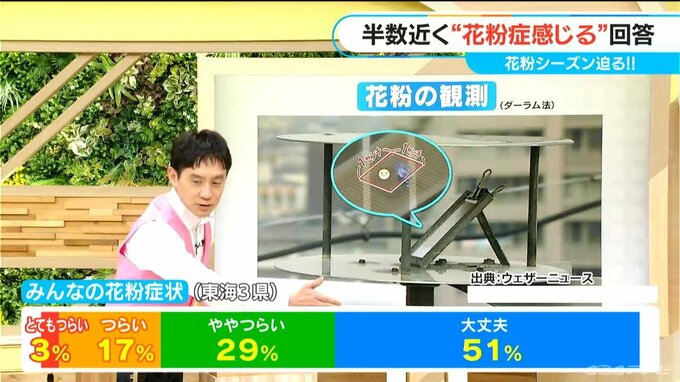 ウェザーニュースのアンケート調査(23日時点)によりますと、実際に症状が出ている人も多くて、花粉症状が「とてもつらい」「つらい」「ややつらい」と答えた人は、すでに半数の49%。