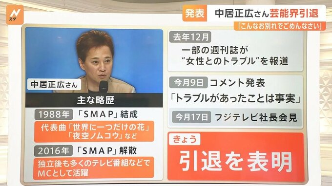時系列で振り返っていくと、▼2024年12月に一部の週刊誌が女性とのトラブルを報道し、▼1月9日に中居さんが「トラブルがあったことは事実」とコメントを発表。▼17日にフジテレビ社長の会見が行われ、▼きょう23日に引退表明となりました。