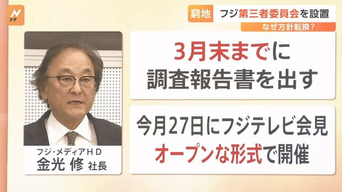 フジ・メディアHD 金光修社長は「3月末までに調査報告書を出す」「1月27日にフジテレビとして会見を行う、オープンな形式で開催する」と話しました。