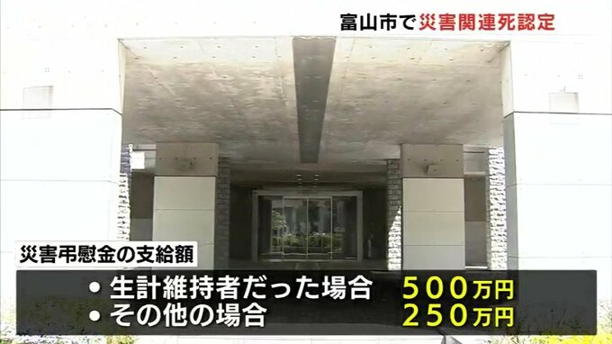 認定については、去年12月に遺族から申し出を受けた富山市が災害弔慰金等支給審査会に諮問し死亡と災害に因果関係があるとの答申を受けて災害関連死と認定しました。