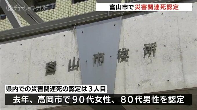 災害関連死を巡っては、去年、高岡市で90代女性と80代男性の2人が認定されていて県内での認定は今回で3人目となりました。