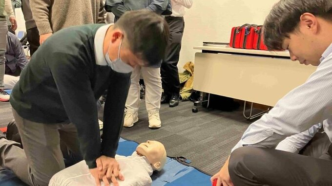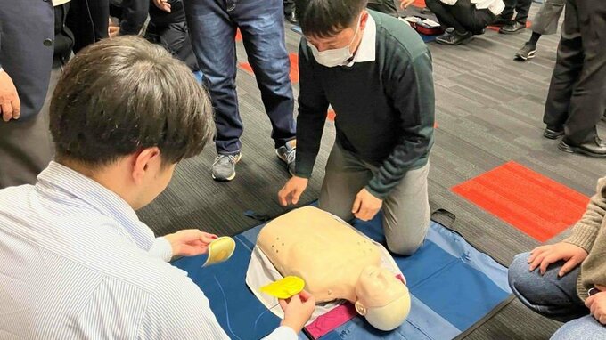 参加した社員は専門家の指導を受けながら人体模型を使って、自動体外式除細動器「AED」の使い方を練習したり、心肺蘇生の仕方を確認したりして、基本的な人命救助について学びました。