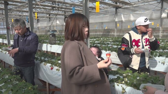 今年は燃料費の高騰で、イチゴ狩りの料金が去年と比べ最大300円値上がりしたものの、24日は午前中から県外からの客が訪れ、口いっぱいにイチゴをほおばっていました。