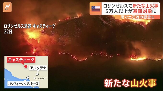 ロサンゼルス近郊で新たに山火事が発生し、およそ5万人の住民が避難の対象となっています。風にあおられ激しく燃え上がる炎から、ぎりぎりで脱出するトラック。ロサンゼルス近郊で今月7日に発生した山火事の消火活…