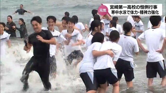 宮崎市の海水浴場で高校生たちが恒例の寒中水泳に挑みました。宮崎第一高校が毎年行っている寒中水泳。その目的は生徒たちの体力、そして精神力の強化です。今年は、2年生と3年生合わせておよそ300人が参加。まず…
