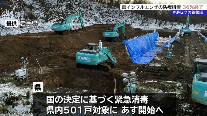 岩手県内2つの養鶏場で鳥インフルエンザへの感染のため進められているニワトリの殺処分は、24日午前9時までに全体の36%が終了しました。