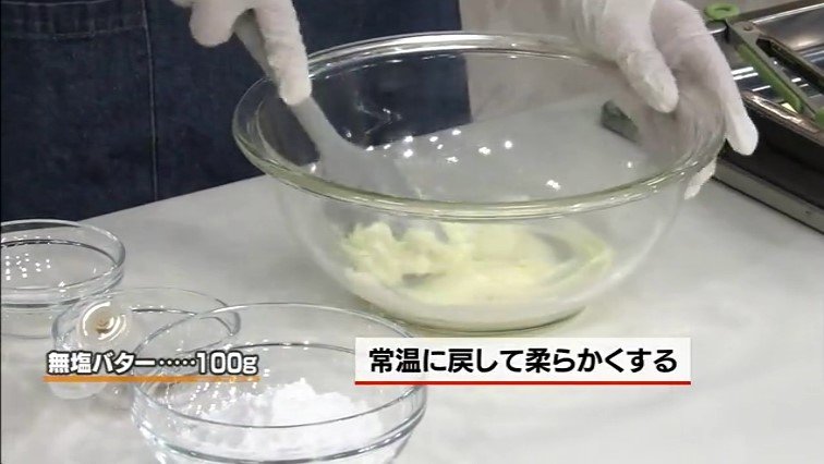 1.常温に戻した無塩バターを混ぜて柔らかくし、粉糖とバニラエッセンス・塩を加えて混ぜる。