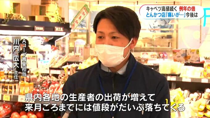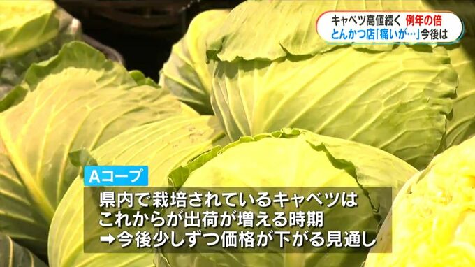 Aコープによりますと県内で栽培されているキャベツはこれからが出荷が増える時期で、今後、少しずつ価格が下がる見通しです。